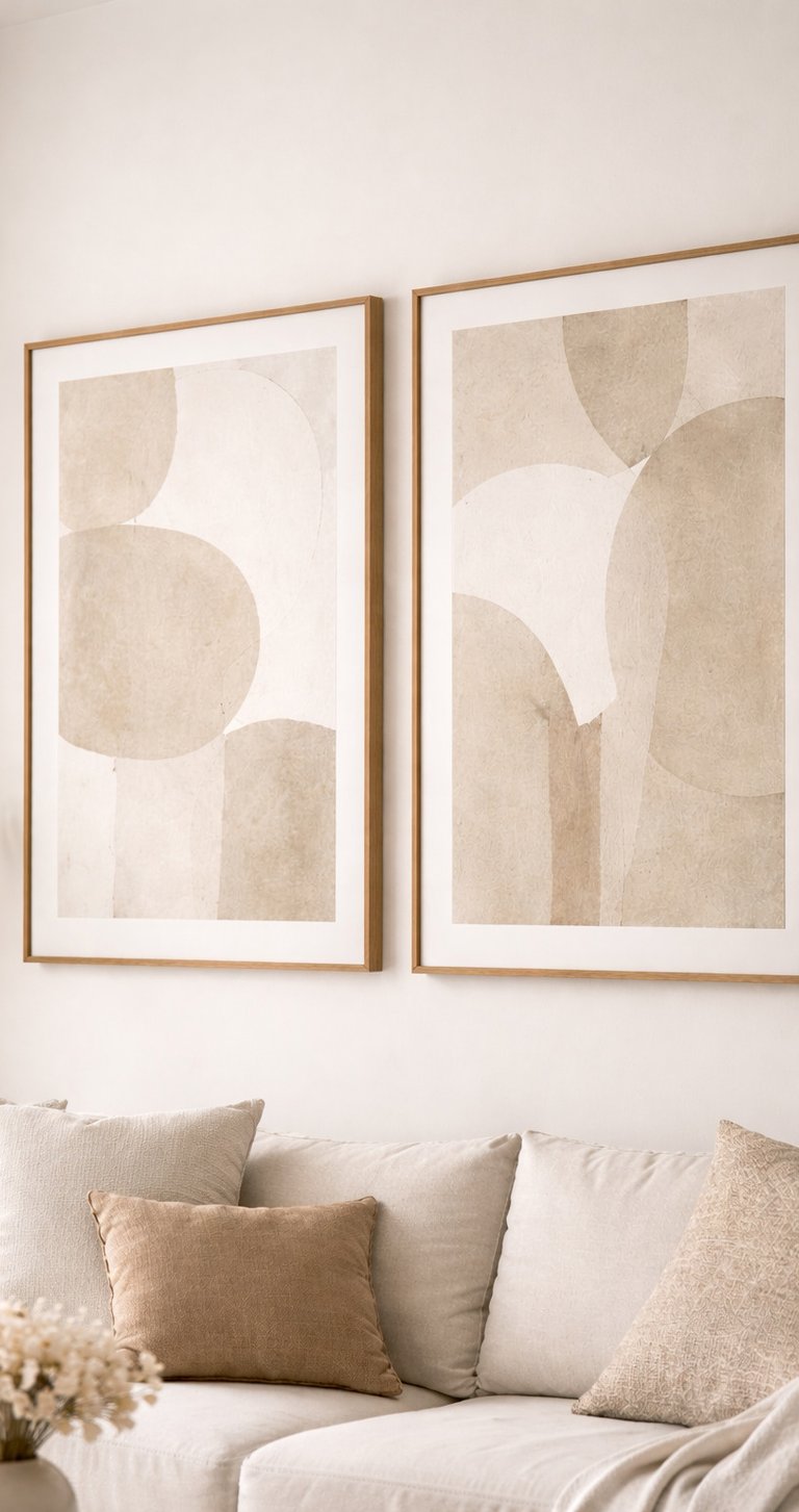 Minimalist wall art fits perfectly with beige sofas, light wood furniture, and natural fabrics. Everything feels connected and harmonious.