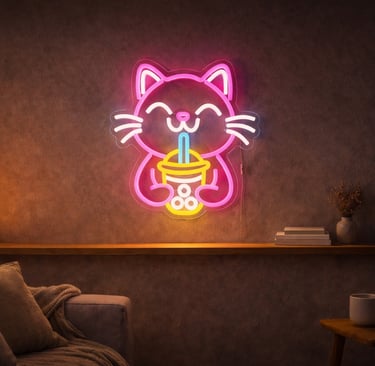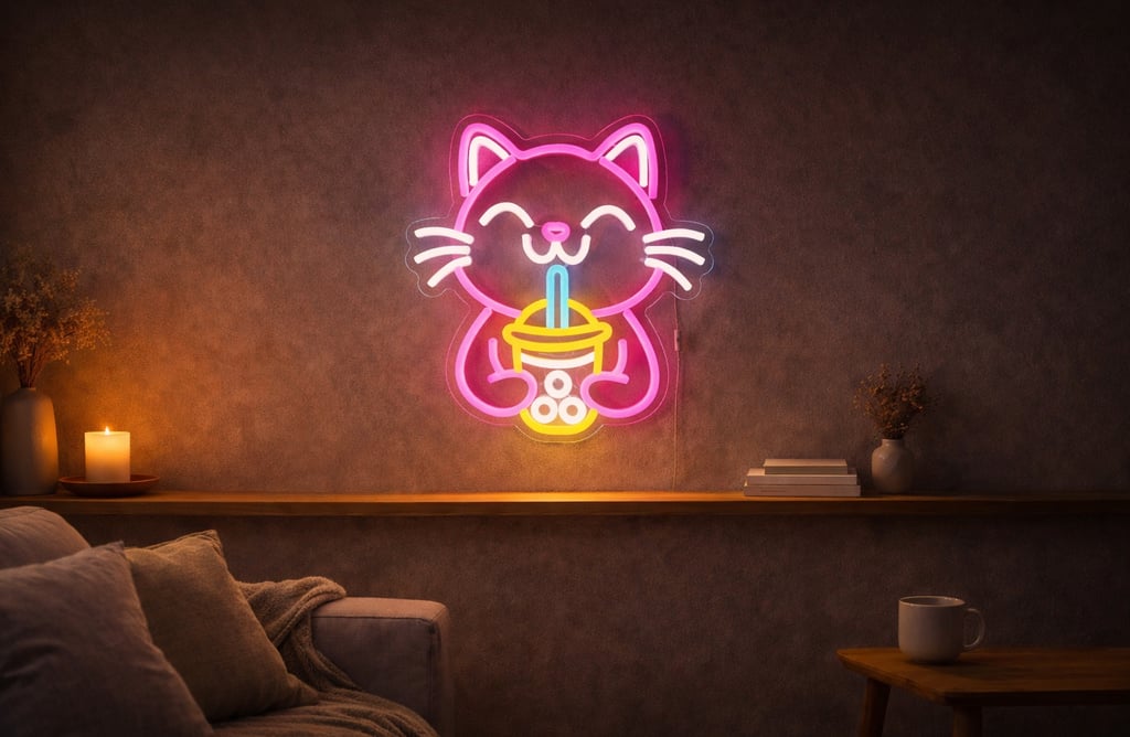 The glowing cat holding its boba adds life to your wall without trying too hard.
