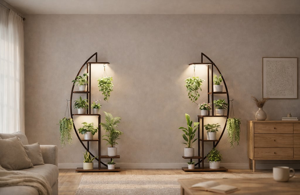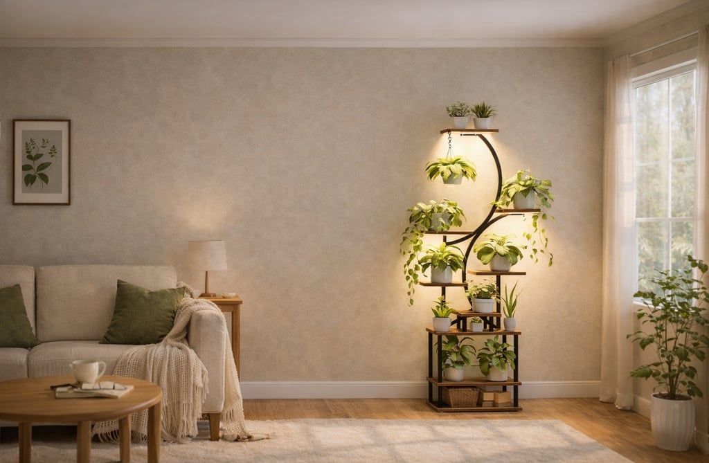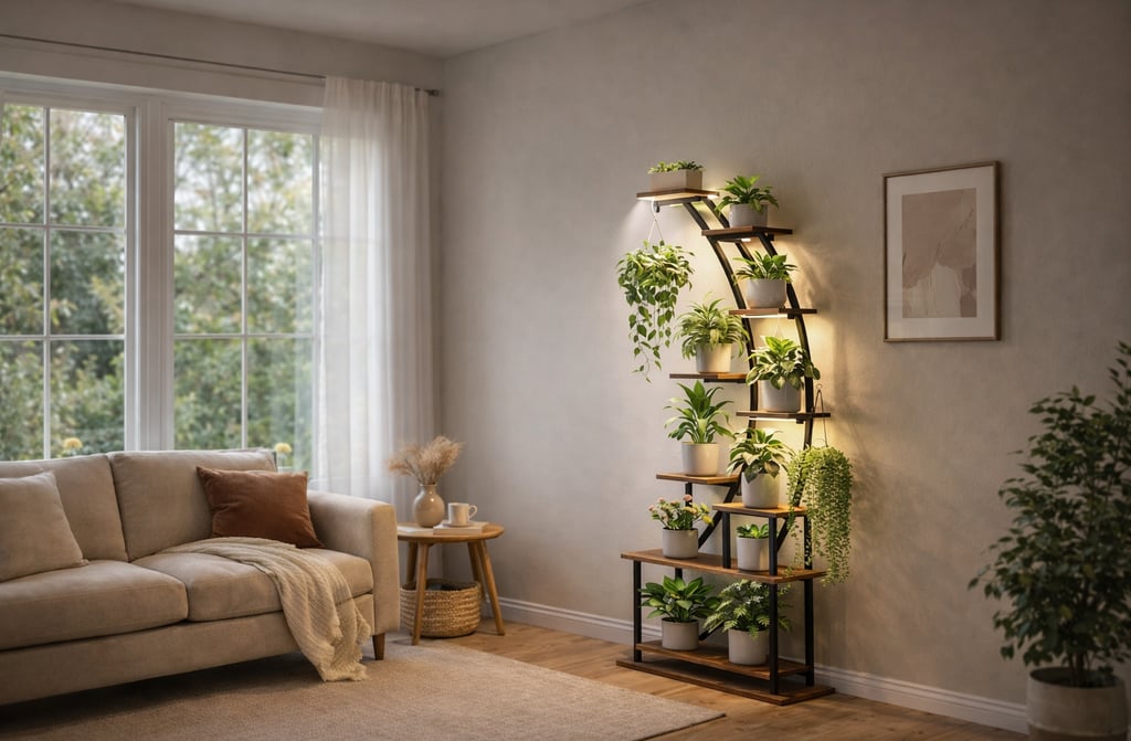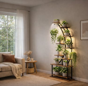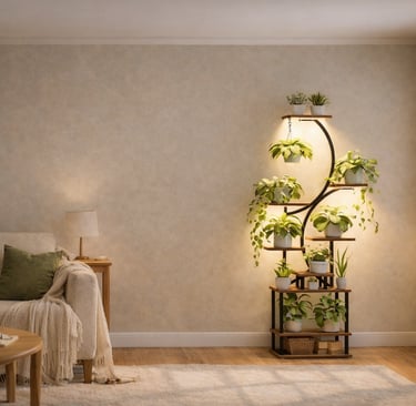 It fits perfectly in a corner and lets you display many plants without taking up space. The gentle built-in lights help your plants grow well, even if your home doesn’t get much sun. And everything feels more balanced and organized.