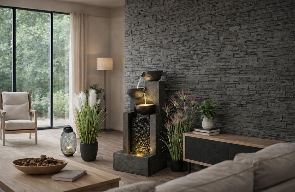 The water flows from the upper basin down into the main pool, creating a steady, comforting sound. You can place it freely, and it instantly gives the room a more grounded, peaceful feeling.